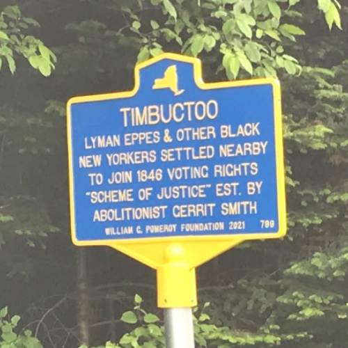This plaque is all that remains of Timbuktu, a fledgling black community founded in the Adirondacks on land granted to free blacks by abolitionist Garrett Smith. Nearby is John Brown’s farm, which is also also the inspiration for Russell Banks’ award-winning 1998 book about John Brown’s life, Cloudsplitter.